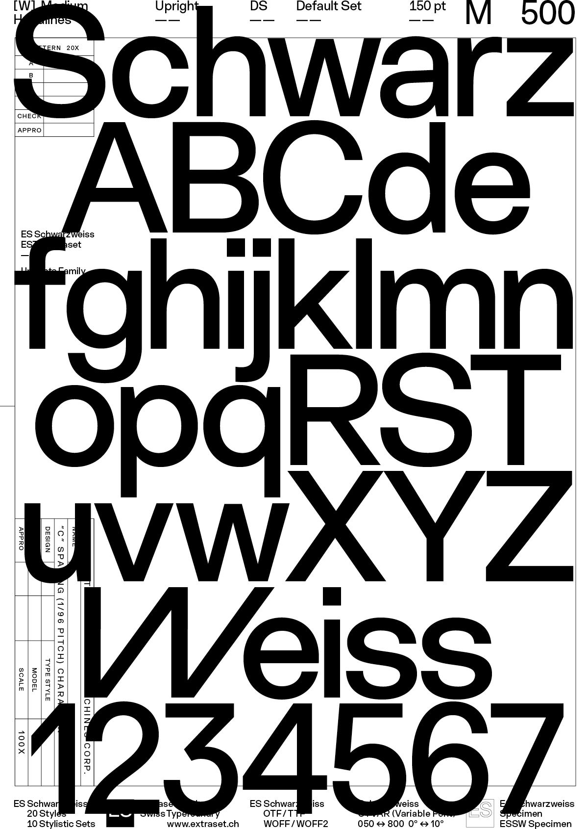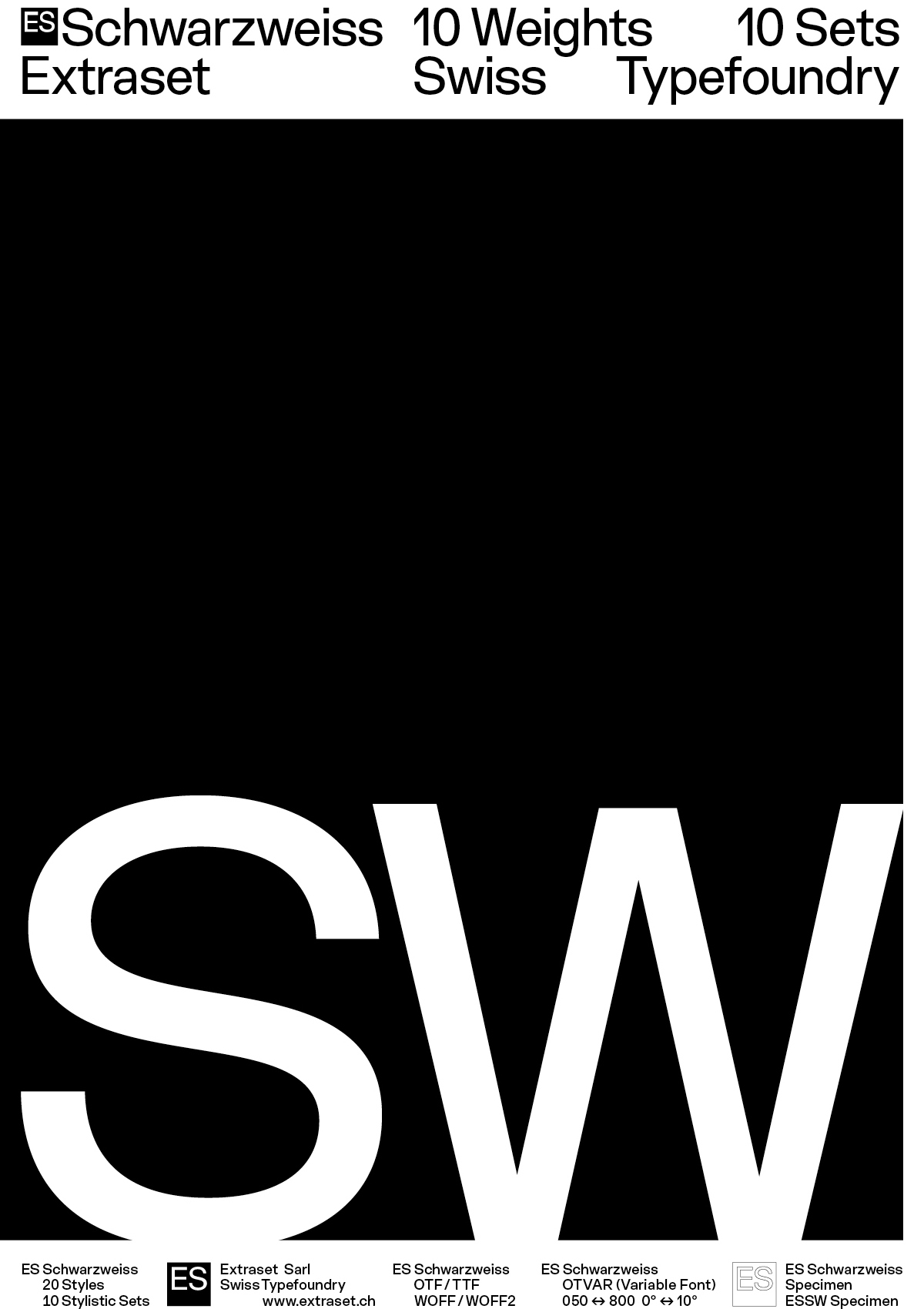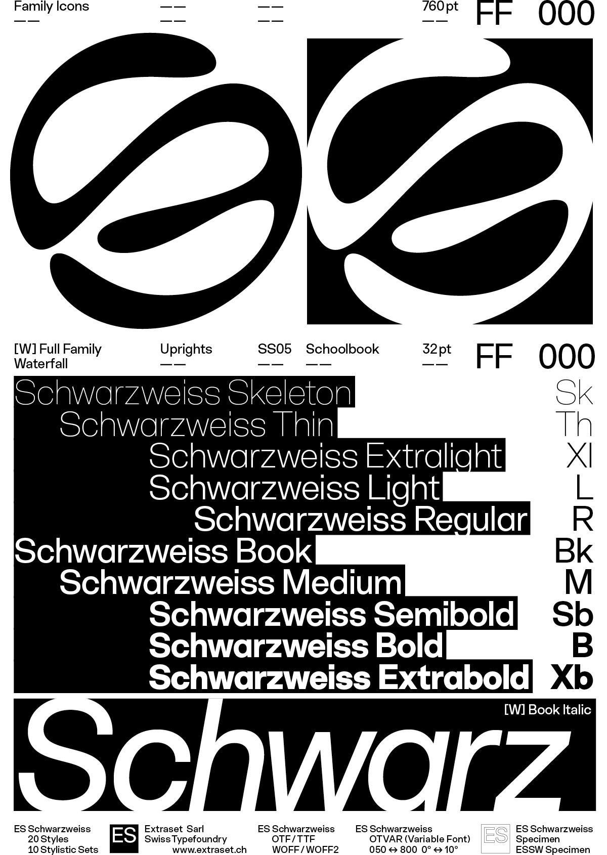 Over time, the font has constantly evolved in terms of finishing touches and glyph extensions, until it perfectly met the designer’s expectations. Ensuring a clean and homogeneous contrast across the spectrum, the result tends to timeless elegance, offers broad language coverage, and alternative stylistic systems that modulate readability affinities or allow for a more graphic approach to title composition. Schwarzweiss is a font family composed of 10 weights and related italics, 10 stylistic sets, and a variable font.